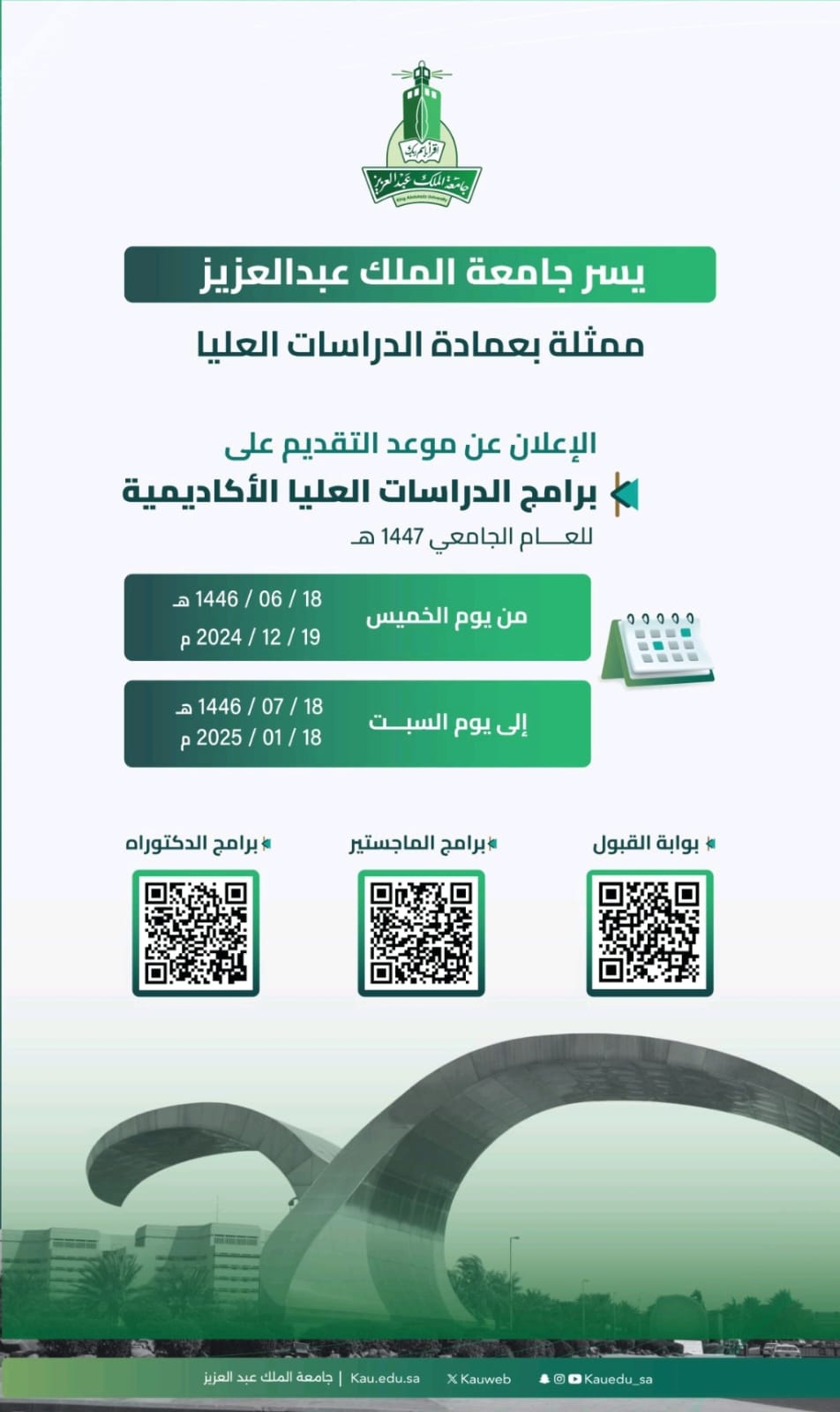 সৌদি আরবের কিং আব্দুল আজিজ ইউনিভার্সিটি জেদ্দায় মাস্টার্স ও পিএইচডিতে স্ক.. Details