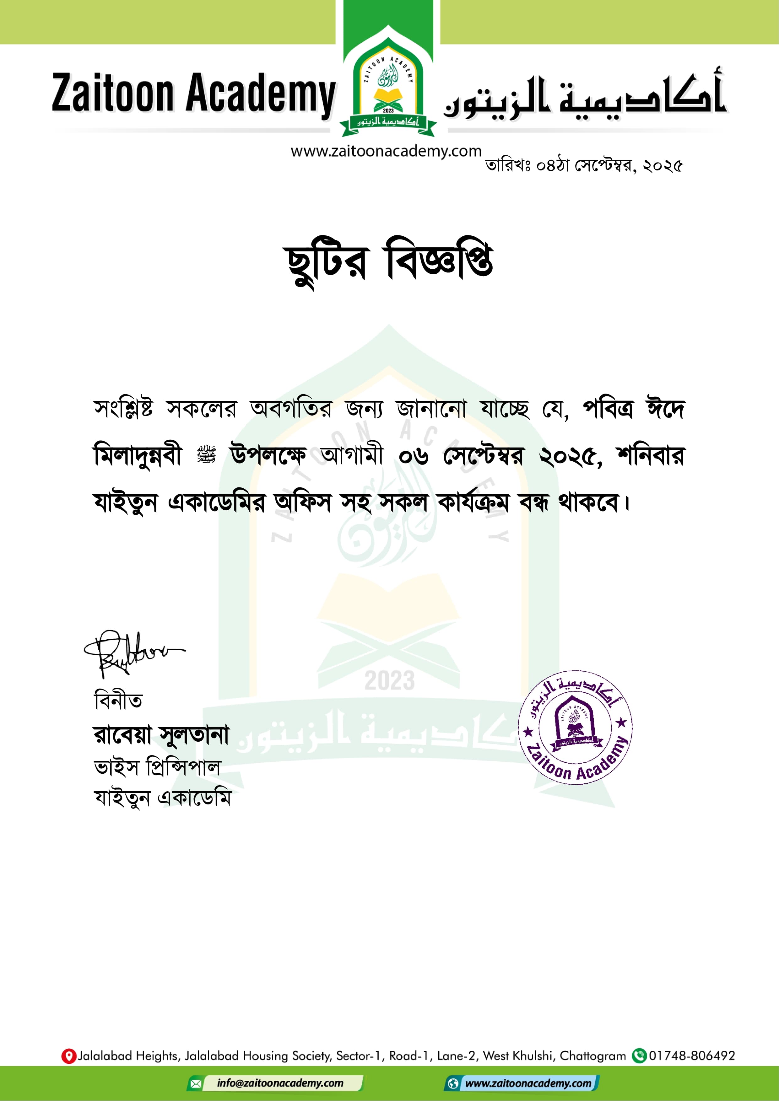 পবিত্র ঈদে মিলাদুন্নবী ﷺ উপলক্ষে ছুটির বিজ্ঞপ্তি | ০৬ সেপ্টেম্বর ২০২৫ Recent Notice অভিভাবক ও বিভাগীয় প্রধানদের সাক্ষাৎকার – ২০২৬ ১ম অভিভাবক-শিক্ষক বৈঠক (PTM) ২০২৬ - এর সময়সূচী | ০৭ মার্চ ২০২৬, শনিবার পবিত্র লাইলাতুল ক্বদর ও ঈদুল ফিতর - ২০২৬ উপলক্ষে ছুটির বিজ্ঞপ্তি List of Winners - Ahkamus Siam Quiz Competition-2026 স্প্রিং সেমিস্টার - ২০২৬ এর মিড টার্ম পরীক্ষা সংক্রান্ত বিশেষ বিজ্ঞপ্তি পবিত্র মাহে রমাদান উপলক্ষে একাডেমির সময়সূচী সংক্রান্ত বিশেষ বিজ্ঞপ্তি আন্তর্জাতিক মাতৃভাষা দিবস - ২০২৬ উদযাপন উপলক্ষে বিশেষ বিজ্ঞপ্তি | ২১শে ফেব্রুয়ারী ২০২৬ পবিত্র রমাদানের ১ম দিন উপলক্ষে ছুটির বিজ্ঞপ্তি ত্রয়োদশ জাতীয় সংসদ নির্বাচন উপলক্ষে ছুটির বিজ্ঞপ্তি RAMADAN COMPETITION & ISLAMIC ROLE PLAY (রমাদান কুইজ প্রতিযোগিতা ও ইসলামিক রোল প্লে) - 2026 পবিত্র মাহে রমাদান উপলক্ষে খাদ্য ও ইফতার বিতরণ কর্মসূচি - ২০২৬ পবিত্র শবে বরাত উপলক্ষে ছুটির বিজ্ঞপ্তি - ০৫ ফেব্রুয়ারি ২০২৬ গাড়ি সার্ভিস বন্ধ থাকা সম্পর্কে জরুরী নোটিশ Vacation Notice for 18 January 2026 Notice Regarding Annual Study Tour for the Students of Classes Two, Three, Four, Five, Six, Mutafarriqa - All Sections & Tahfeez - Female Section - 2026
