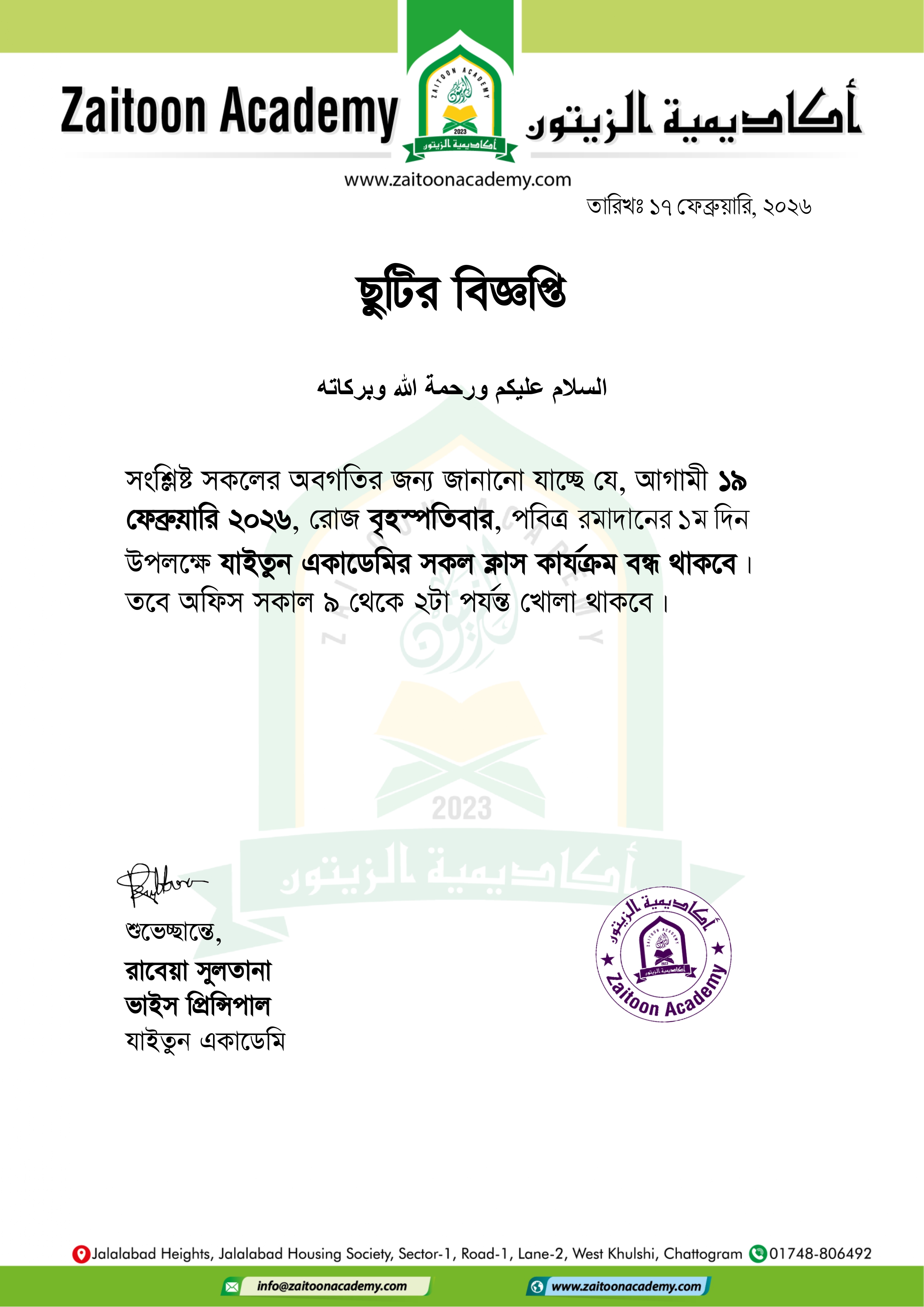 তারিখঃ ১৭ ফেব্রুয়ারি, ২০২৬ ছুটির বিজ্ঞপ্তি السلام عليكم ورحمة الله وبركاته সংশ্লিষ্ট সকলের অবগতির জন্য জানানো যাচ্ছে যে, আগামী ১৯ ফেব্রুয়ারি ২০২৬, রোজ বৃহস্পতিবার, পবিত্র রমাদানের ১ম দিন উপলক্ষে যাইতুন একাডেমির সকল ক্লাস কার্যক্রম বন্ধ থাকবে। তবে অফিস সকাল ৯ থেকে ২টা পর্যন্ত খোলা থাকবে। শুভেচ্ছান্তে, রাবেয়া সুলতানা ভাইস প্রিন্সিপাল যাইতুন একাডেমি